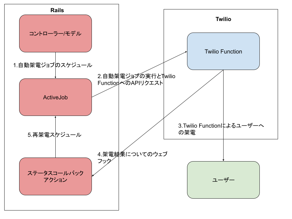 - Twilioから架電ステータスに関するウェブフックがRailsアプリケーションへ送信されます。
