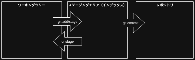 Gitでは、ワーキングツリー(作業ディレクトリ)でのコード変更をいきなりレポジトリにコミットするのではなく、ステージングエリア(別名:インデックス)と呼ばれる中間地点に一度追加してからコミットします。