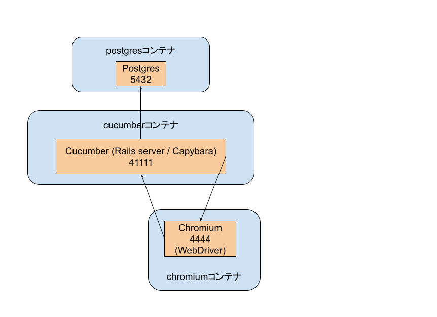 - cucumber: E2Eテストの実行。Railsのアプリケーションサーバーを立ち上げると共に、WebDriverプロトコルを使用してchromiumコンテナを遠隔操作してテストを実行します。
