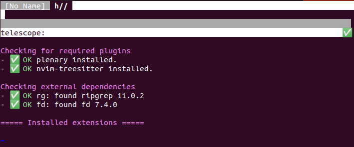 インストール後、以下のコマンドを実行して「Health Check」を行い、依存関係(ripgrepとfd)が正しく認識されているか確認しましょう。