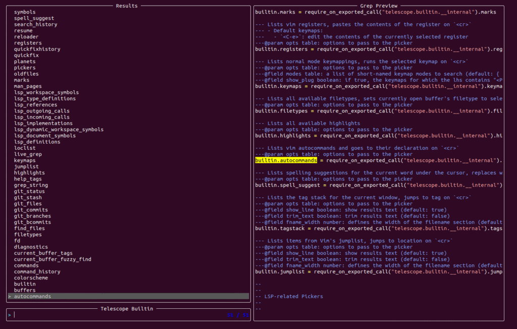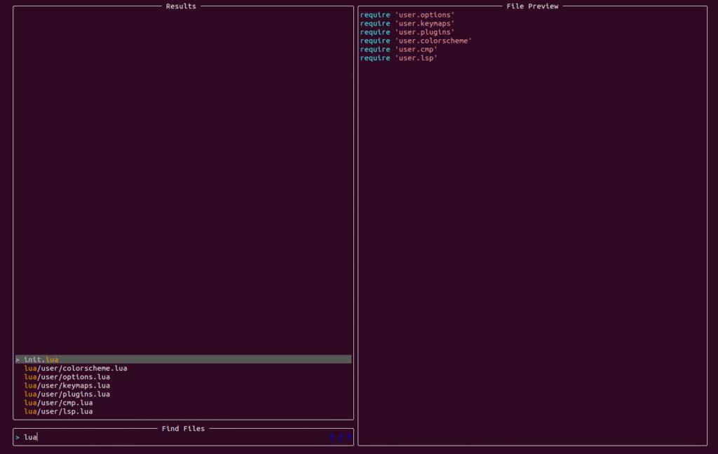 Telescopeのコマンドは、Neovimのコマンドラインモードで :Telescope command_name と入力して実行します。実行するとウィンドウが開き、検索結果を表示してくれます。