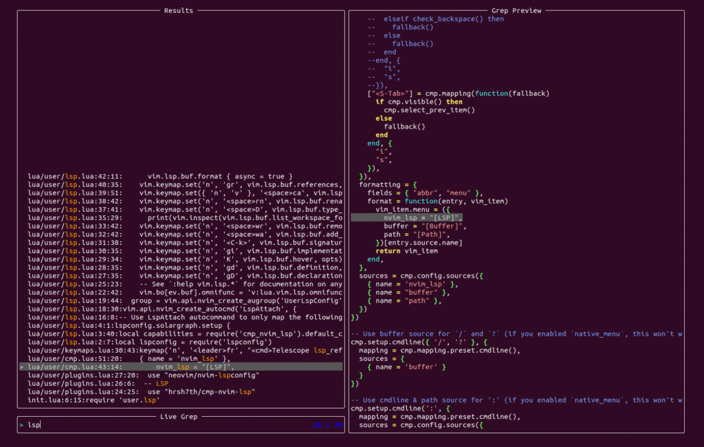プレビュー画面では、該当する行をハイライトしてくれます。 通常の :grep コマンドとは異なり、一文字入力するごとにリアルタイムで結果が絞り込まれ、プレビューも表示されるため非常に便利です。