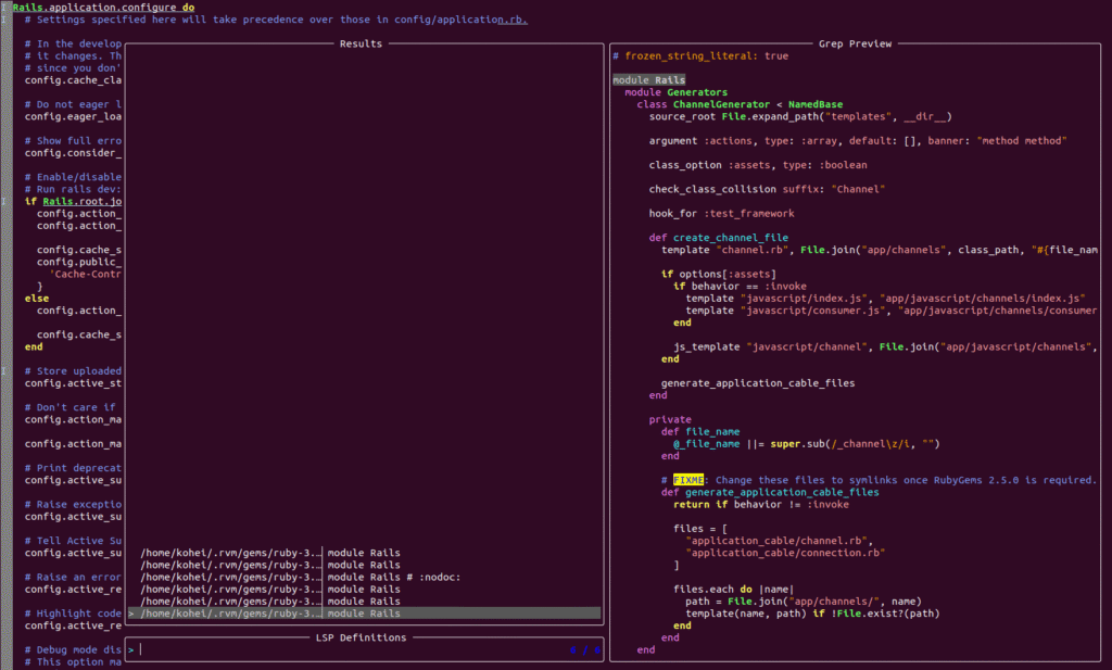 例:RubyのLSPを使い、Railsという名前空間が定義されているファイル候補を表示