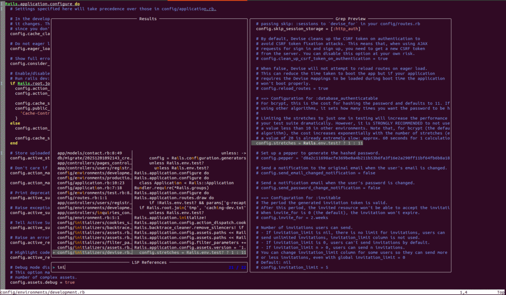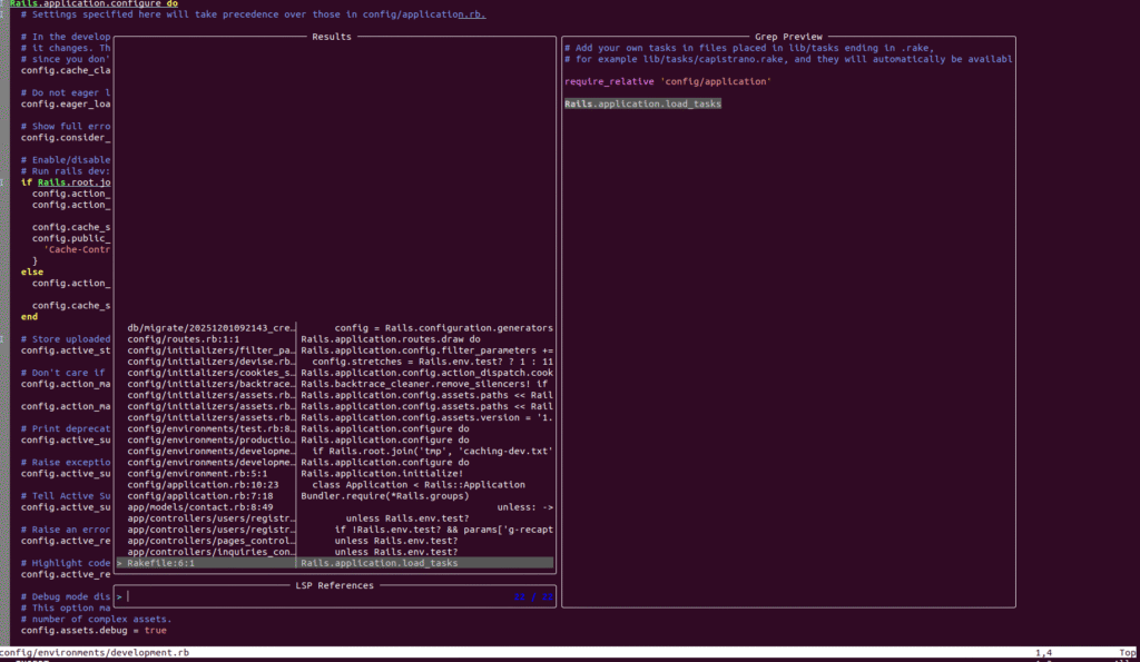 例:RubyのLSPと連携し、Rails という定数を参照しているファイルと該当行をリスト表示。