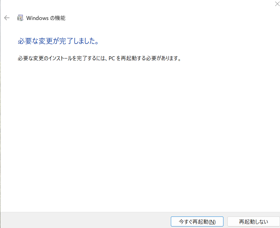 ※自動的に「仮想マシンプラットフォーム」が有効になり、最新のWSLパッケージとUbuntuがインストールされます。